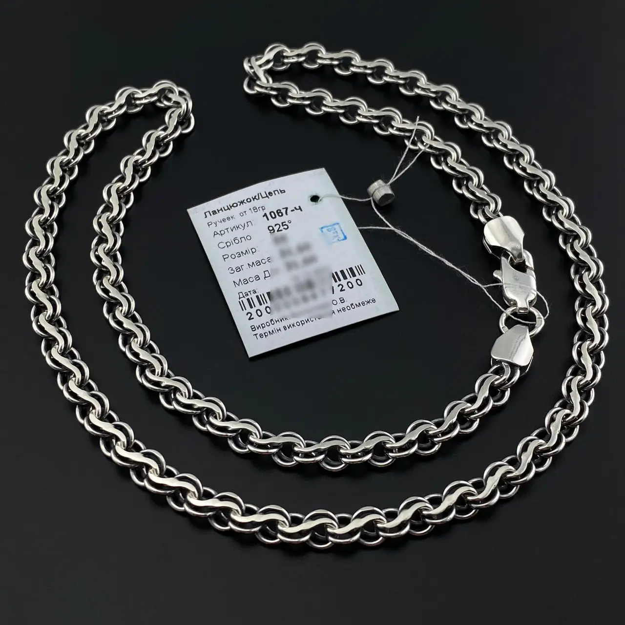Вага 13 г, ширина 4,5 мм, довжина – 50-60 см, матеріал – срібло 925 проби. Срібний ланцюжок Бісмарк