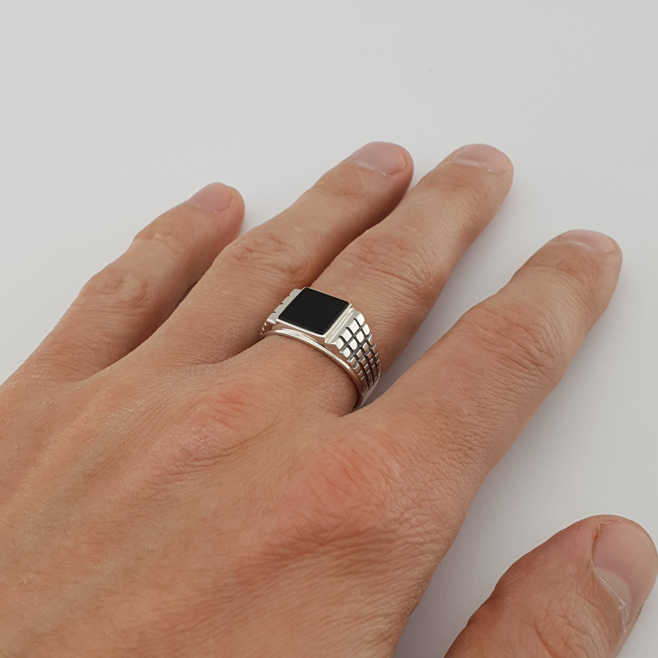 Чоловіча срібна печатка з оніксом підійде впевненому в собі чоловікові. Прикраса, декороване великим оніксом підійде благородному і гідного чоловіка, адже виглядає розкішно і красиво. Виготовлено з якісного срібла 925 проби. Шинку кільця декорована квадратними насічками, виглядає вельми незвично і привабливо.