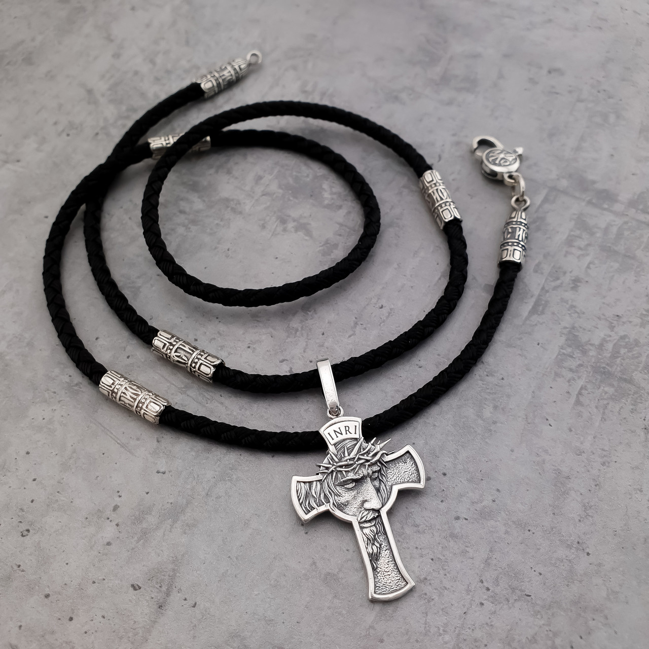 Срібний хрестик з цепочкою із шовку. Хрест "Образ" та шовковий шнурок зі срібними вставками і замком